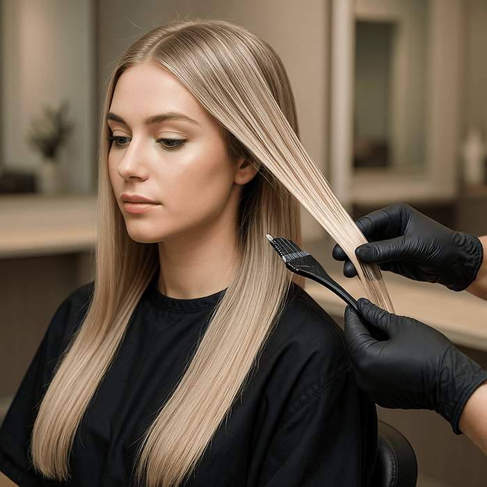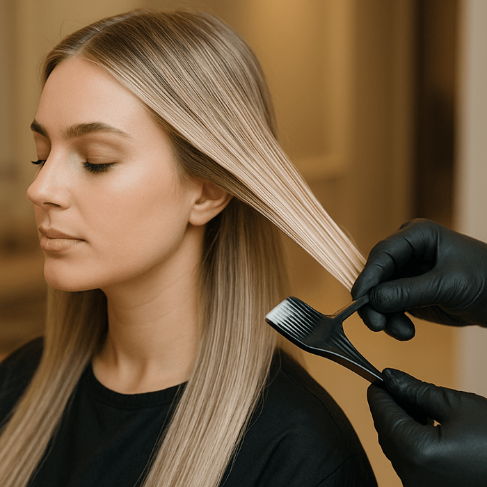 Precizno nanošenje Blonde Keratin formule pramen po pramen, pazeći na ravnomerno raspoređivanje tonirajućih pigmenata.